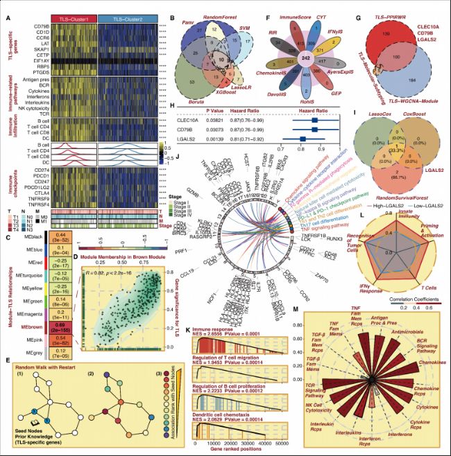 影響因子:27.7文章摘要:癌癥研究的最新進展突顯了三級淋巴結構(TLS)在調節免疫反應中的關鍵作用,尤其是在乳腺癌(BRCA)中。在這里,利用基于生物網絡的計算策略和機器學習(ML)方法對來自 6000 多個 BRCA 樣本的大量轉錄組數據進行了綜合分析,并確定 LGALS2 是 TLSs 中的一個關鍵標記。單細胞測序和空間轉錄組學揭示了LGALS2在TLS相關樹突狀細胞(DCs)刺激中的作用,并揭示了腫瘤微環境(TME)在宏觀和微觀層面的復雜性。LGALS2 表達的升高與生存期的延長有關,而生存期的延長與以多樣化免疫細胞浸潤和活躍的抗腫瘤通路為特征的強健免疫反應有關,這導致了 “熱 ”腫瘤微環境。蘇木精-伊紅(HE)、免疫組織化學(IHC)和體內驗證分析證實了LGALS2與TLS相關DC的共定位及其在BRCA免疫激活中的作用。將 LGALS2 鑒定為 BRCA 的一個關鍵因素,不僅凸顯了它在新型 TLS 引導的免疫療法中的治療潛力,還為患者分層和治療選擇開辟了新途徑,最終改善了臨床管理。