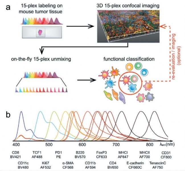 上述過程由分子和細胞之間復雜的相互作用驅動。因此,使用熒光成像研究這些過程的實驗設計需要能夠區分和定位大量標記物,由抗體識別并與合適染料結合的靶抗原。