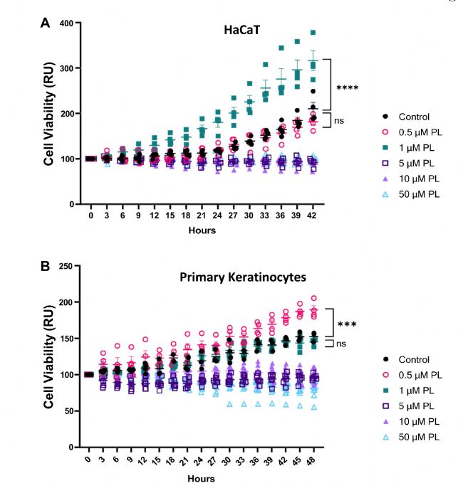 研究人員用蓽茇酰胺處理HaCaT細胞,并在42小時內每3小時根據物鏡下的匯合計數細胞數(圖1A)。通過采用活細胞成像技術,利用