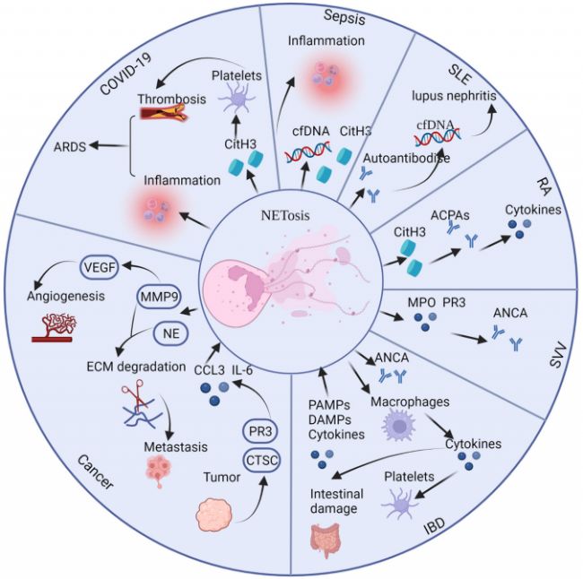 NETs通過殺死細菌、真菌、病毒和寄生蟲等病原體來保護宿主免受感染。然而,除了在抗菌中發揮核心作用外,NETs也被證明在許多傳染性和非傳染性疾病的病理生理學中發揮了有害作用。NETs失調可損害宿主組織,促進自身免疫的發展,并導致其他功能障礙,包括轉移、血栓形成和不適當的凝血。最近的證據表明,NETs可能在非感染性疾病中發揮作用,包括系統性紅斑狼瘡、類風濕性關節炎、糖尿病、動脈粥樣硬化、血管炎、血栓形成、癌癥、傷口愈合和創傷等疾病[3,4]。總之各種類型的腫瘤和炎癥性疾病均可做NETs方向的研究。