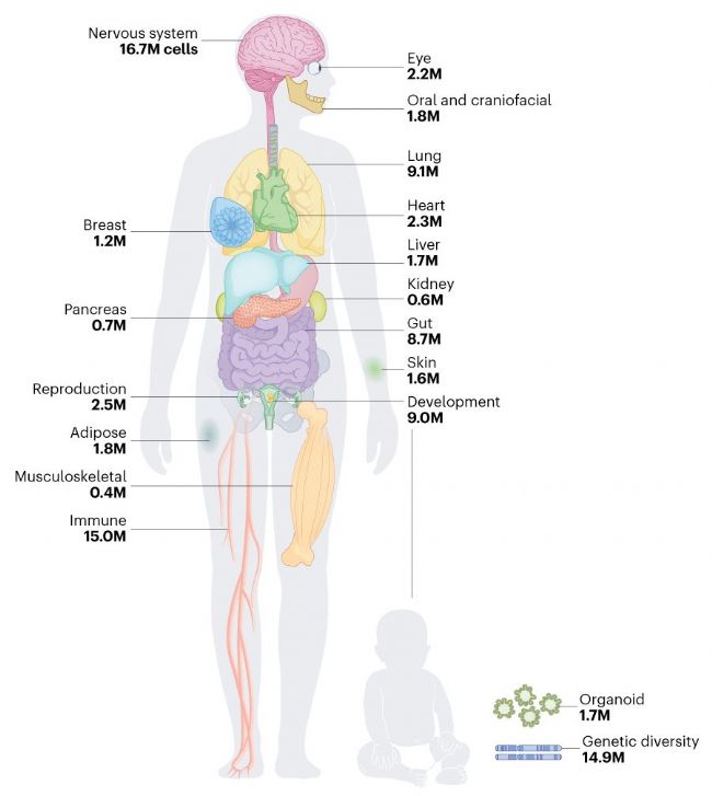 人類細胞圖譜(Human Cell Atlas, HCA)聯盟成立于2016年,旨在構建人體每一個細胞的生物圖譜。自2017年發布白皮書以來,該聯盟已發展成為一個擁有102個國家3600多名成員的全球網絡,為18個生物網絡提供數據。HCA數據門戶網站目前擁有從約9,100名捐贈者收集的約6,200萬個細胞的數據。為便于數據整合,該聯盟正在構建18個HCA生物網絡圖譜,如圖1所示。每個網絡整合了與單個組織或器官相關的所有可用HCA數據。