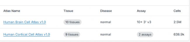 神經系統網絡圖譜(Nervous System Network)目前共包含有Human Brain Cell Atlas v1.0和Human Cortical Cell Atlas v1.0兩個數據集。涉及19個組織,3.1M個細胞的數據(圖2)。