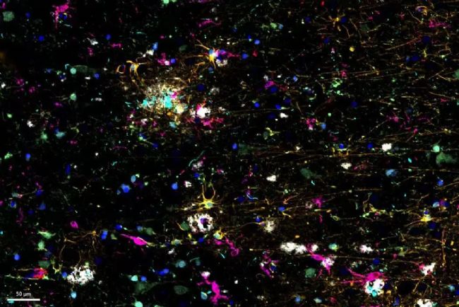 阿爾茨海默病(AD)是一種復(fù)雜的神經(jīng)退行性疾病,以神經(jīng)纖維纏結(jié)、β-淀粉樣蛋白斑塊和神經(jīng)炎癥為特征。這些功能障礙會引發(fā)或加劇局部免疫反應(yīng)。因此,了解神經(jīng)免疫與空間環(huán)境的相互作用對于闡明AD發(fā)病機(jī)制至關(guān)重要。在這里,我們利用 Cell DIVE 的循環(huán)染色成像技術(shù)和 Aivia 的人工智能輔助空間分析技術(shù)來研究 AD 病理標(biāo)志周圍的免疫細(xì)胞。