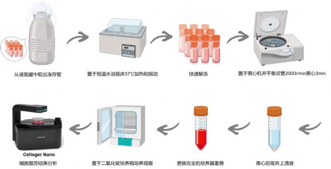 - 細胞懸液制備:將融化的細胞懸液轉移到離心管中,加入適量的培養基稀釋并離心(如1000轉/min,5min),以去除凍存液中的DMSO等有害物質。
