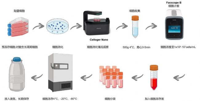 - 細胞凍存:將細胞重懸于凍存液中并分裝到滅菌的凍存管中,標明細胞種類、凍存日期等信息。然后按照4℃ 30min、-20℃ 30min、-80℃過夜的程序進行梯度降溫處理,最后轉移到液氮罐中長期保存。