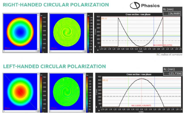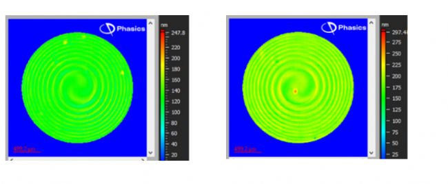 Phasics的QWLSI技術(shù)不會(huì)受到偏振的影響,因此在從右旋圓偏振切換到左旋圓偏振時(shí),我們的設(shè)備仍然可以對(duì)波前進(jìn)行詳細(xì)表征。圖2展示了波前曲率的變化。此外,可以通過(guò)濾掉主要的波前曲率來(lái)揭示殘余波前誤差,這些誤差反映了更高空間頻率的缺陷(見(jiàn)圖2中間的左側(cè)相位圖)。