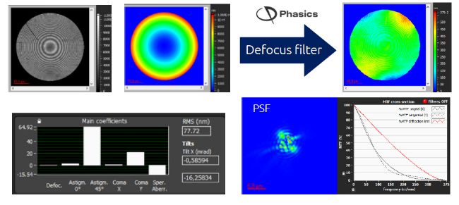 在圖4中,我們對(duì)一個(gè)PB金屬透鏡進(jìn)行了測(cè)量。Phasics的SID4-HR波前傳感器的高動(dòng)態(tài)范圍能夠同時(shí)捕捉主要波前曲率,并通過(guò)像差過(guò)濾顯示所需要的光學(xué)像差。