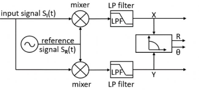 把這兩個信號分別叫做實部分量X =Vmix1與虛部分量Y =Vmix2,因此我們得到了鎖相放大器采集到的輸出信號兩種形式,一種包含信號強度幅值R和相位差