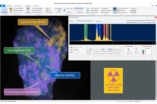 使用 Neoscan N90 臺式納米 CT 掃描黃銅礦(Calcopyrite)樣品,XRF 系統分析其化學成分