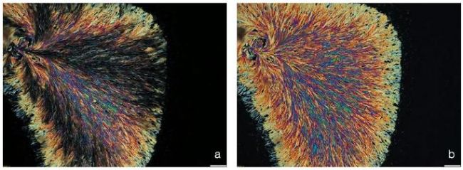 圖1. 使用Evident公司的偏振光顯微鏡、SLIDEVIEW VS200研究級玻片掃描儀和MPLFLN40X(0.75 NA)物鏡對維生素C晶體進行成像:a)使用線性偏振光顯微鏡;b)使用圓形偏振光顯微鏡。(a)使用線性偏振,我們可以看到等旋線特征(黑帶)。(b)為同一樣品使用圓形偏振,我們看不到任何偽影。