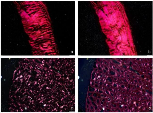 圖3. 結締組織和骨骼的圖像,在偏振光下可觀察到不同方向的膠原纖維。a)使用線性偏振光可視化的結締組織。b)使用圓形偏振光可視化的結締組織。c)使用線性偏振光可視化的橫向骨切片。d)使用圓形偏振光可視化的橫向骨切片。橫向排列的膠原纖維呈現亮色,而縱向排列的膠原纖維呈現暗色。介于橫向和縱向之間方向排列的纖維顯示出深淺不一的灰色。使用VS200研究級玻片掃描儀和MPLAPON50X(0.95 NA)物鏡拍攝的圖像。