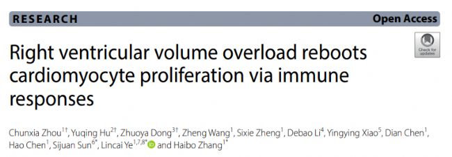 Zhou C, Hu Y, Dong Z, Wang Z, Zheng S, Li D, Xiao Y, Chen D, Chen H, Sun S, Ye L, Zhang H. Right ventricular volume overload reboots cardiomyocyte proliferation via immune responses. J Transl Med. 2024 Nov 28;22(1):1075. doi: 10.1186/s12967-024-05839-8. PMID: 39609689; PMCID: PMC11604012.
