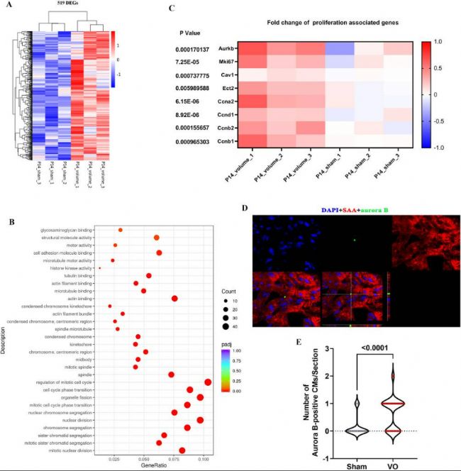 作者通過對RVVO模型中的基因表達數據進行GO和KEGG分析,與細胞質分裂、細胞增殖相關基因表達上調(圖2A-圖2B),表明RVVO可能促進了青春期前心肌細胞的增殖。下調的差異表達基因的GO富集分析結果表明前30個GO term與心臟收縮相關,這表明由于RVVO,心臟收縮能力降低。這個結果間接表明RVVO誘導了青春期前CM的增殖。