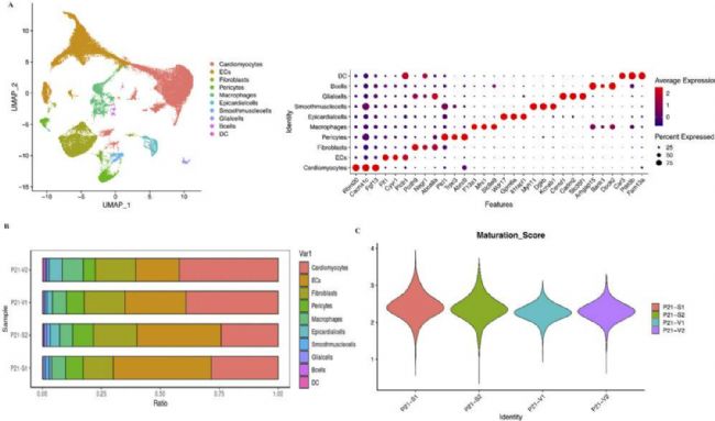 作者對出生后小鼠第21天(P21)的右心室(RV)進行單細胞轉錄組測序來驗證之前的結果。發現右心室內有10種不同類型的細胞(圖3A),并且在RVVO組中CM的比例顯著高于假手術組(圖3B)。為了進一步確認這些結果,作者使用Seurat功能模塊計算了CM成熟基因(包括Myh6, Tnni3, RYR2, SERCA2, CACNA1C, 和 KCNJ2)的成熟度評分。結果顯示,RVVO組的成熟度評分低于假手術組(圖3C),這表明RVVO可能促進了青春期前CM的增殖。總之,這些發現表明RVVO不僅增加了CM的數量,而且還影響了它們的成熟過程,導致CM成熟度降低,從而可能促進了它們的增殖。