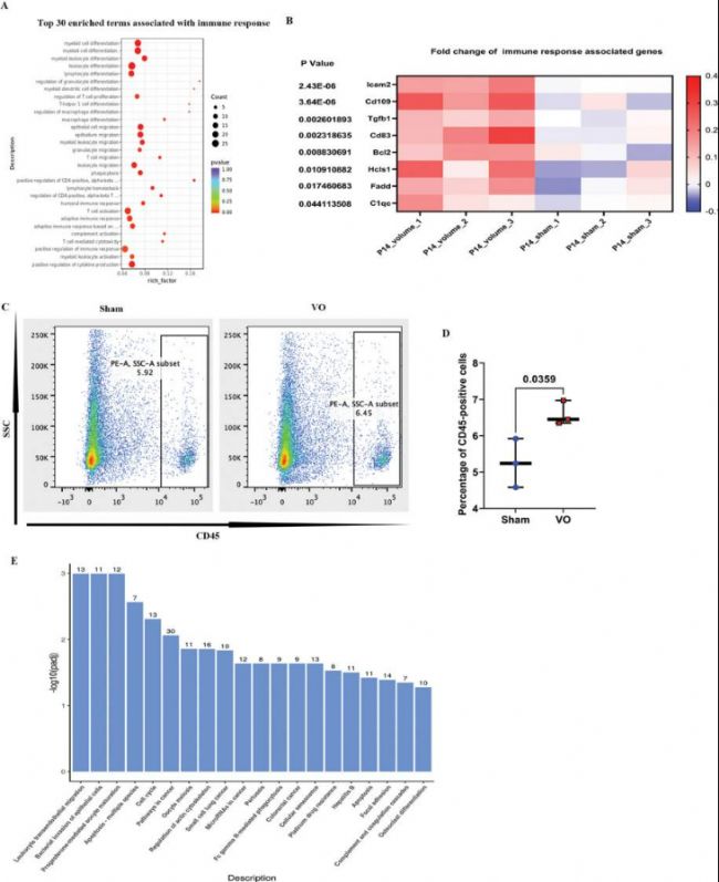 先前的研究表明RVVO在新生階段(從P1到P7)會觸發免疫反應。因此,作者關注了上調的差異表達基因,發現與免疫反應相關的GO 條目處于第二(圖4A–B)。通過進一步評估免疫細胞,發現RVVO增加了免疫細胞的比例(圖4C-D)。此外,在上調DEGs的KEGG通路分析中,免疫反應是前三富集通路之一(圖4E)。因此,免疫反應可能是導致青春期前心肌細胞增殖重啟的原因。