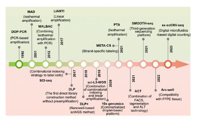Fig 5.單細(xì)胞全基因組擴(kuò)增和測(cè)序技術(shù)的發(fā)展概況。圖表的上半部分顯示了標(biāo)記的主要事件scWGA和低通率scWGS技術(shù)的發(fā)展,以及吞吐量的發(fā)展