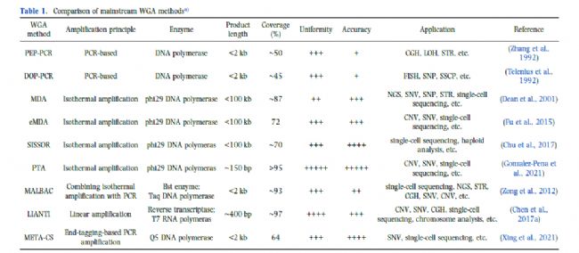 由于單個(gè)細(xì)胞中的DNA含量有限(約6pg/細(xì)胞),沒有達(dá)到測(cè)序儀的檢測(cè)要求,因此必須在測(cè)序前放大單個(gè)細(xì)胞中微量的全基因組DNA。該擴(kuò)增過程的目的是生成高覆蓋率的全基因組,確保后續(xù)高通量測(cè)序中準(zhǔn)確和全面的測(cè)序結(jié)果。隨著時(shí)間的推移,WGA技術(shù)發(fā)生了重大變化,以滿足這些需求。值得注意的方法包括簡(jiǎn)并寡核苷酸引物聚合酶鏈反應(yīng)(DOP-PCR)(Telenius,1992),多重置換擴(kuò)增(MDA)(Dean,2001),以及多重退火和基于循環(huán)的擴(kuò)增循環(huán)(MALBAC)(Zong,2012)。隨后的創(chuàng)新,如通過轉(zhuǎn)座子插入的線性擴(kuò)增(LIANTI)(Chen,2017),單鏈測(cè)序利用微流控反應(yīng)器(SISSOR),初級(jí)模板定向擴(kuò)增(PTA)(Gonzales -Pena,2021)和互補(bǔ)鏈的多重末端標(biāo)記擴(kuò)增(META-CS)(Xing,2021)進(jìn)一步擴(kuò)展了WGA工具包。表1給出了這些方法的一般特征的概述。在下面的章節(jié)中,將回顧幾種主要的WGA方法,重點(diǎn)關(guān)注它們的覆蓋范圍、均勻性和準(zhǔn)確性。簡(jiǎn)而言之,放大性能沒有明顯的贏家,每種策略根據(jù)重要的參數(shù)都有優(yōu)勢(shì)。