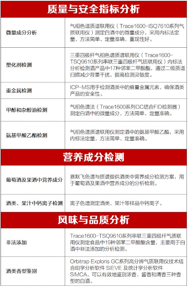 除了風味檢測,針對原材料中可能引入的農藥殘留、重金屬污染,在加工、發酵過程中可能產生的甲醇、雜醇油等成分的檢測,以及在酒的存儲和過輸過程中可能引入的重金屬、塑化劑等問題,賽默飛均可提供相應的檢測產品及技術。