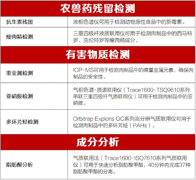 除了檢測獸藥殘留,賽默飛在肉制品檢測方面提供了其他全面的解決方案,涵蓋了從抗生素殘留、瘦肉精非法添加到動物源性食品檢測以及肉類真實性鑒定等多個方面。