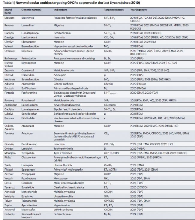 過去 5 年(自 2019 年以來),共新增 37 種 GPCR 靶向藥物獲批,其中 7 種為首次獲批的受體,包括胃抑制多肽受體(GIPR)、GPRC5D、C5A1、神經激肽 3 受體(NK3)、黑皮質素受體 3、4 和 5(MC3/4/5)。最新獲批的 GPCR 靶向藥物為 KarXT(Cobenfy),該藥物是由 xanomeline(一種選擇性 M1/M4 毒蕈堿受體激動劑)和 trospium(一種外周毒蕈堿受體拮抗劑)組成的聯合療法,是首個用于治療精神分裂癥的新型藥物。