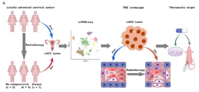 宮頸癌是全球女性中廣泛存在的、極具挑戰(zhàn)性的惡性腫瘤,是癌癥相關死亡的第三大原因。放射治療是局部晚期宮頸癌(LACC)的重要治療方法,但由于復發(fā)率較高,其預后仍較差。值得注意的是,LACC患者在放療后的疾病復發(fā)大致上會出現(xiàn)局部復發(fā)和遠處復發(fā)這兩種不同模式。一些患者在照射區(qū)域內(nèi)復發(fā),而另一些則出現(xiàn)遠端復發(fā)病灶。不同的復發(fā)模式與不同的患者預后密切相關。研究團隊的前期研究(Adv Sci | 白永瑞/景瑩/唐建明團隊合作揭示局部晚期宮頸鱗狀細胞癌放療療效相關分子特征)發(fā)現(xiàn),放射治療引起的腫瘤微環(huán)境(TME)中基質(zhì)細胞和腫瘤細胞的分子層面改變與放療敏感性相關。因此,研究者們從放療引起的TME改變的角度來進一步的尋找不同復發(fā)模式的特異性分子特征。