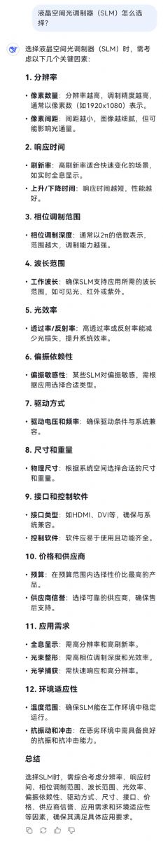 Deepseek的回答相當精準:分辨率、相位調制范圍、響應時間、波長范圍、光學效率、驅動方式、尺寸和形狀、軟件和接口、應用需求等等,一個都沒落下。這幾個性能確實是液晶空間光調制器(SLM)選購的關鍵。