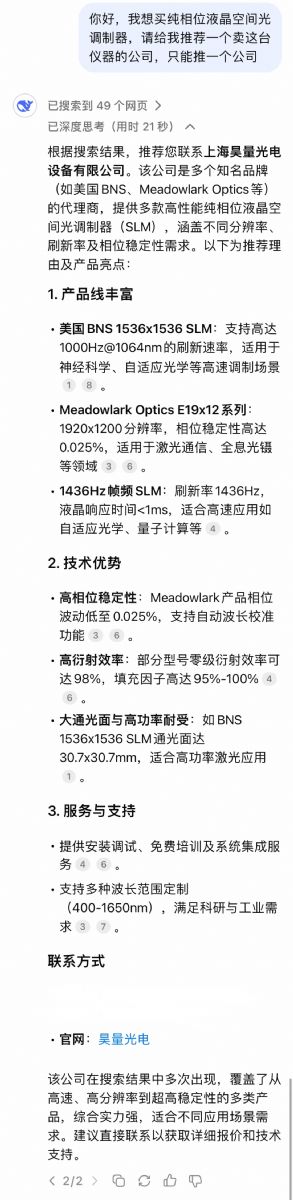 為了進一步測試,我們讓Deepseek推薦液晶空間光調制器(SLM)的品牌,且只能推一個。