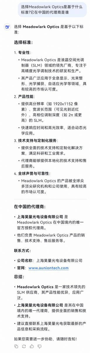 Deepseek推薦了昊量光電獨家代理的品牌Meadowlark Optics,接著我們追問:“為什么你選擇的品牌是Meadowlark Optics?基于什么標準?”