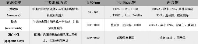 目前,科學界將細胞外囊泡(extracellular vesicle)大致分為三大類:微泡(microvesicle)、凋亡小體(apoptotic body)和外泌體(exosome)(表1)。微泡是指由細胞分泌的一種直徑為100~1000nm的膜囊泡;凋亡小體是指細胞程序性死亡過程中所釋放的一種直徑為500~4000nm的膜囊泡;外泌體則是一種直徑為30~100nm、主要由細胞內多泡體與細胞膜融合并釋放到細胞外基質中的膜囊泡,后者在電鏡下表現為脂質雙層包裹的扁平球體,呈特征性的杯狀外形。同源性的外泌體形態均一、大小相近,而不同來源的外泌體直徑可略有不同。