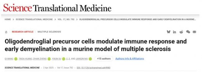 2025年4月2日,由陸軍軍醫大學牛建欽教授、萬瑛教授與中山大學附屬第七醫院易陳菊研究員聯合帶領的研究團隊在Science translational medicine上發表題為“Oligodendroglial precursor cells modulate immune response and early demyelination in a murine model of multiple sclerosis”的研究論文,首次揭示了少突膠質前體細胞(Oligodendrocyte precursor cell, OPC)在多發性硬化(Multiple Sclerosis, MS)早期病理過程中觸發免疫反應級聯激活,并導致快速脫髓鞘的新機制。
