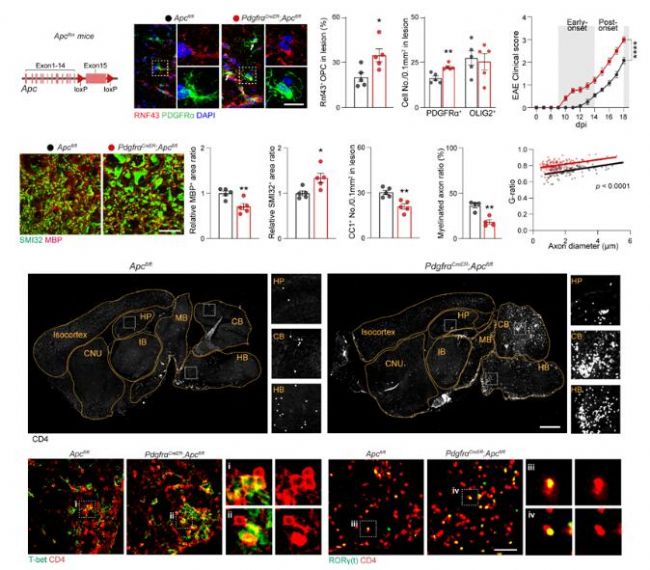 研究團隊通過構建OPC特異性Wnt通路激活小鼠(PdgfraCreER;Apcfl/fl),發現實驗性自身免疫性腦脊髓炎(experimental autoimmune encephalomyelitis, EAE)模型癥狀大大加重,并且脫髓鞘損傷從脊髓擴展至腦,模擬真實MS患者病理特點(圖1)。相反,敲除OPC(PdgfraCreER;DTA小鼠)則大大緩解疾病進程。這表明,Wnt過度激活的OPC是MS病理的關鍵驅動因素。