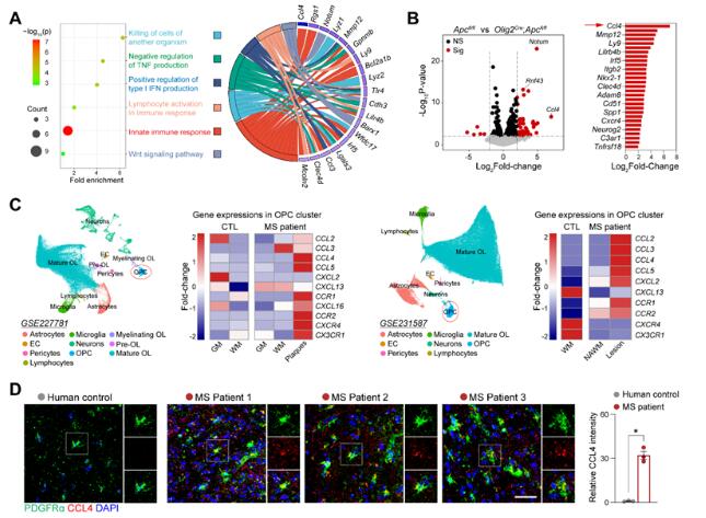 通過RNA-seq測序、MS單細胞數據庫分析與免疫染色,研究團隊發現Wnt激活的OPC高表達趨化因子CCL4,而人類MS患者的白質病灶OPC中同樣存在CCL4異常上調(圖2)。值得注意的是,特異性敲除Ccl4基因可大大減少免疫細胞浸潤并緩解脫髓鞘,提示靶向CCL4通路或為治療突破口。
