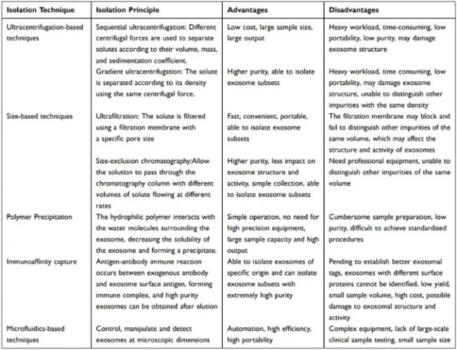 在外泌體研究領域,有五大類方法已被用于分離和純化這些納米大小的囊泡。這些方法包括超速離心法、基于外泌體尺寸的分離技術、聚合物沉淀法、免疫親和法以及微流體技術。在這里,我們簡要總結了這些技術的原理、優點和缺點,如圖2所示。
