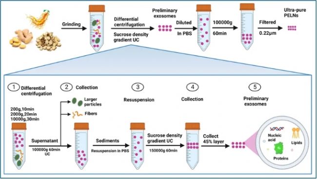 圖3 植物來源的類外泌體納米囊泡(PELNs)提取方法:超速離心結合蔗糖密度梯度離心