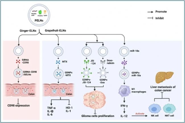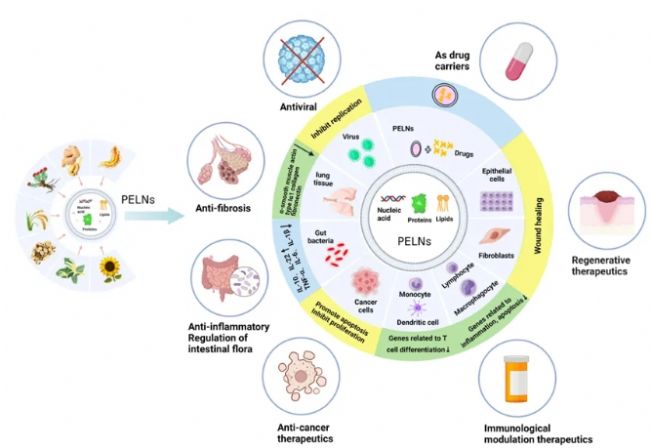 優異的生物相容性、組織滲透性和理化穩定性使PELNs能夠跨越各種生理屏障,跨物種細胞間交換信息,作為調節因子直接在病變部位發揮抗炎和抗腫瘤作用。