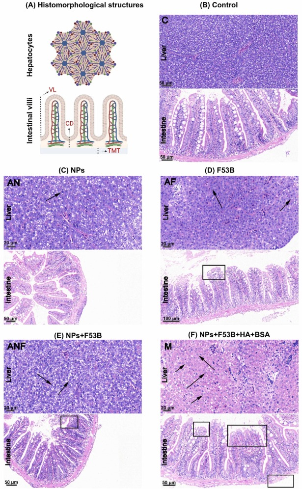 圖1 成年斑馬魚的肝臟和腸道組織于長期暴露于不同處理組21天后的組織病理學變化。(A) 肝細胞和腸絨毛的組織形態結構示意圖;(B)對照組-C;(C) 1 mg/L NPs-AN;(D) 200μg/L F53B-AF;(E) 1 mg/L NPs+ 200 μg/L F53B -ANF;(F) 1mg/L NPs + 200μg/L F53B + 10mg/L HA + 10mg/L BSA-M。其中VL為絨毛長度,CD為隱窩深度,TMT為肌層厚度,黑色箭頭表示肝細胞核收縮,黑框表示腸絨毛萎縮。