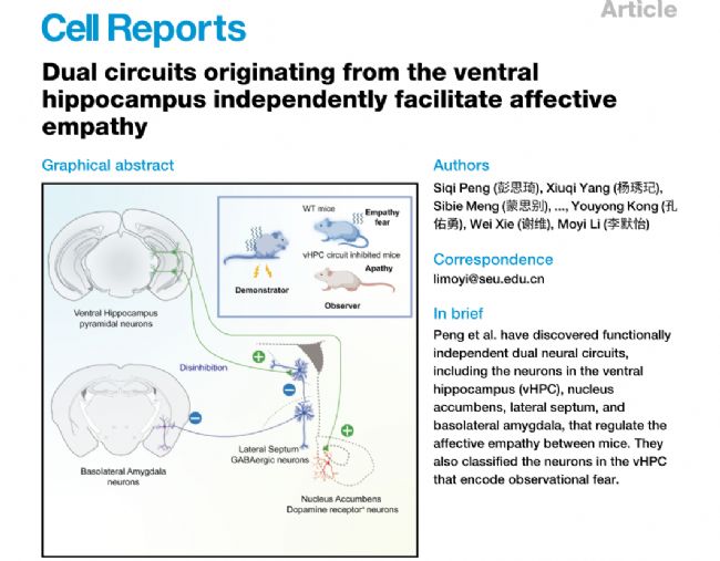 Peng S, Yang X, Meng S, Liu F, Lv Y, Yang H, Kong Y, Xie W, Li M. Dual circuits originating from the ventral hippocampus independently facilitate affective empathy. Cell Rep. doi: 10.1016/j.celrep.2024.114277.