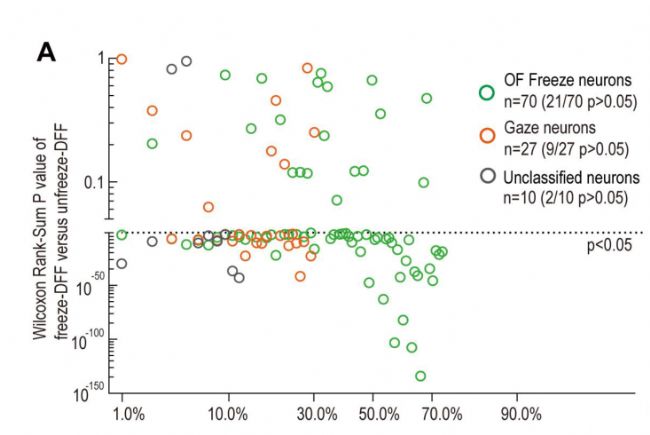 作者首先利用化學(xué)遺傳學(xué)和光遺傳學(xué)手段研究了海馬是否真的能夠調(diào)節(jié)觀察恐懼(Observational Fear ,OF)行為,發(fā)現(xiàn)腹側(cè)海馬,而不是背側(cè)海馬,參與了Naive OF。接下來(lái)為了在亞細(xì)胞結(jié)構(gòu)層面上探討腹側(cè)海馬的機(jī)制,作者利用FHIRM-HR監(jiān)測(cè)vHPC錐體神經(jīng)元(圖1)在OF期間的鈣尖峰,通過(guò)提取并分析不同行為狀態(tài)期間神經(jīng)元的鈣尖峰數(shù)據(jù)來(lái)進(jìn)行細(xì)胞分類,作者發(fā)現(xiàn)并分類了70個(gè)神經(jīng)元為OF Freeze神經(jīng)元,27個(gè)神經(jīng)元為Gaze神經(jīng)元,還有10個(gè)神經(jīng)元未被分類(圖2)。