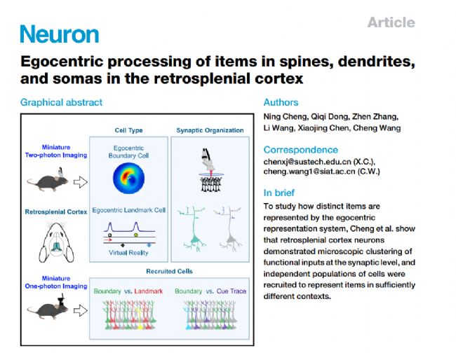 2023年12月14日,中國科學院深圳先進技術研究院腦認知與腦疾病研究所王成研究員團隊和南方科技大學生命科學學院陳小菁助理教授團隊聯合在國際著名期刊Neuron發表題為“Egocentric processing of items in spines, dendrites, and somas in the retrosplenial cortex “ 的研究論文。利用微型化雙光子成像技術等研究手段,該論文首次報道了:1)自我中心神經元在突觸層次信息傳遞過程中呈現功能聚類;2)不同場景募集獨立群體的自我中心神經元。