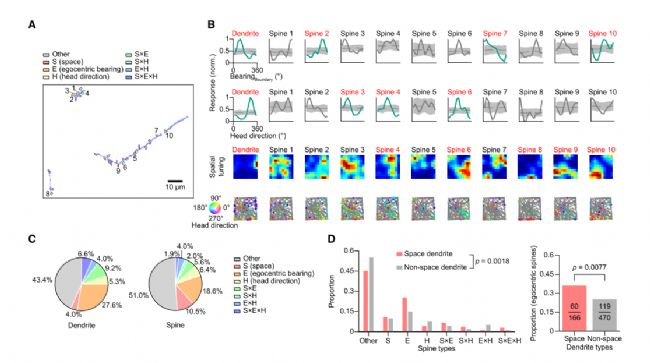 圖2. 樹突和樹棘突中空間選擇性、頭部方向和軸承邊界的交互作用