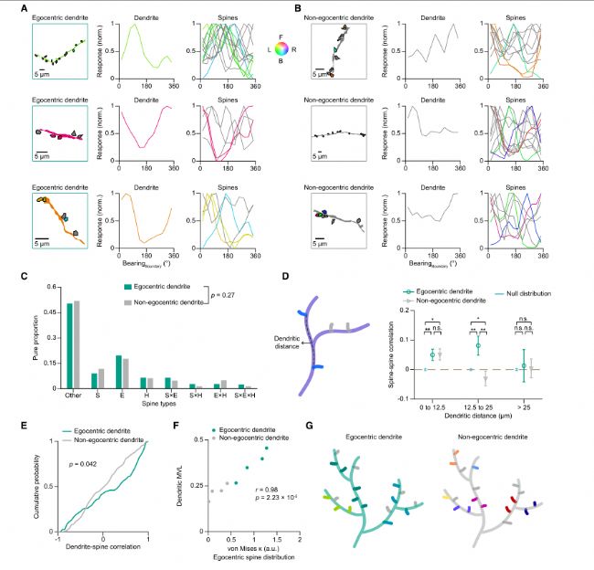 進一步對采集的雙光子數據分析結果顯示,RSC神經元接受了與自我中心信號整合的不同類型的功能輸入,自我中心輸入可能有助于提高分配中心空間選擇性(圖2)。分析樹突棘和樹突的調諧曲線發現,相似調節的自我中心樹棘突的空間聚集可能有助于加強自我中心選擇性,以自我為中心的樹突的調諧相關性顯著大于非以自我為中心的樹突(圖3)。樹突棘的活動特征反映了突觸前輸入的功能屬性,而樹突的活動特性反應了突觸后對輸入進行整合的性質。研究結果揭示了樹突中具有顯著自我中心調諧的功能聚類,這表明可能存在專門的神經功能通道用于處理編碼不同場景中物體的自我中心信息。