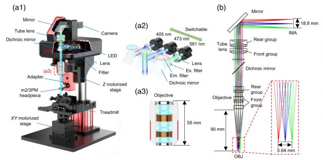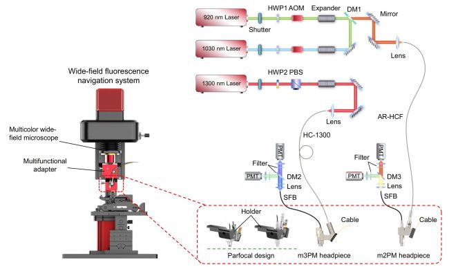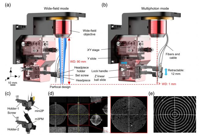 為實(shí)現(xiàn)寬場(chǎng)模式與多光子成像模式間的無(wú)縫切換,該團(tuán)隊(duì)設(shè)計(jì)了一款多功能適配器。該適配器連接寬場(chǎng)物鏡,并在Z軸電動(dòng)平臺(tái)上進(jìn)行焦距調(diào)節(jié)。通過(guò)標(biāo)準(zhǔn)化的m2/3PM探頭設(shè)計(jì),探頭可穩(wěn)固的安裝在同一支架上,并保證了多光子與寬場(chǎng)模式切換時(shí)的齊焦成像。