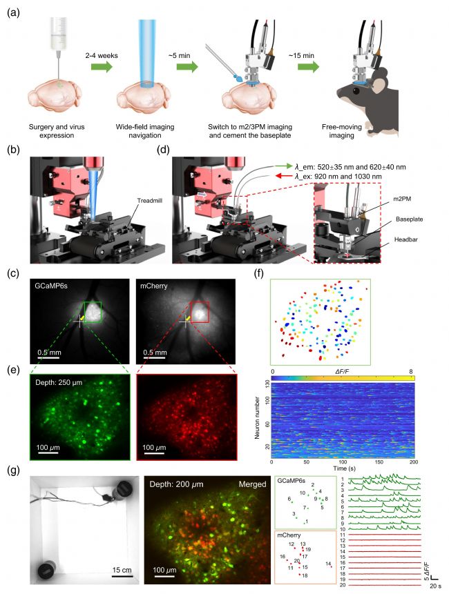 為了讓自由活動(dòng)小鼠中的m2PM成像工作更加順暢,開發(fā)人員建立了一套標(biāo)準(zhǔn)化成像流程,以提高自由活動(dòng)動(dòng)物中m2PM成像的效率。首先對(duì)動(dòng)物進(jìn)行病毒注射和外科手術(shù)操作,如顱窗植入或GRIN Lens植入,隨后等待2-4周確保病毒充分表達(dá)及手術(shù)損傷恢復(fù)。以某次實(shí)驗(yàn)為例,我們?cè)诔跫?jí)運(yùn)動(dòng)皮層(M1)神經(jīng)元中標(biāo)記了GCaMP6s和mCherry,隨后將小鼠固定于WF-Nav裝置下的跑步機(jī)上。接著通過(guò)寬場(chǎng)顯微鏡定位目標(biāo)感興趣區(qū)域并將其對(duì)準(zhǔn)視野中心。隨后通過(guò)適配器切換至m2PM模式,在920nm和1030nm波長(zhǎng)下進(jìn)行雙色雙光子成像,最后對(duì)XY軸和焦平面進(jìn)行精細(xì)調(diào)整,可以在幾分鐘內(nèi)確認(rèn)最終的目標(biāo)區(qū)域。大多數(shù)情況下,會(huì)將目標(biāo)焦平面抬高約25µm,以補(bǔ)償水泥收縮導(dǎo)致的焦點(diǎn)偏移,再將Baseplate固定在動(dòng)物頭部的頭件上,經(jīng)過(guò)約10分鐘的固化后,小鼠即可進(jìn)行自由活動(dòng)成像。