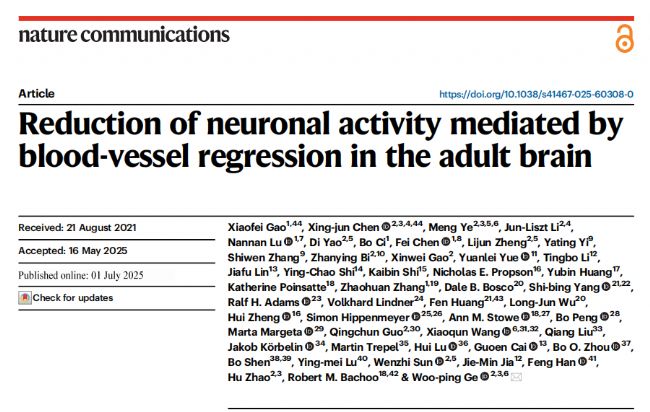 最近,北京腦科學與類腦研究所戈鵡平研究員團隊在《自然通訊》(Nature Communications)期刊發表研究論文“Reduction of neuronal activity mediated by blood-vessel regression in the adult brain”,揭示了腦血管退化可導致神經元活動減弱的現象。