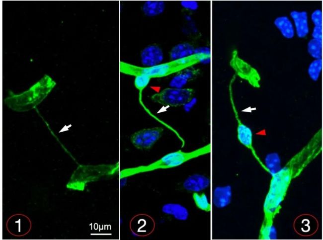 圖1. 腦中發現的三種退化血管的形態,紅色三角形指示的是血管周細胞