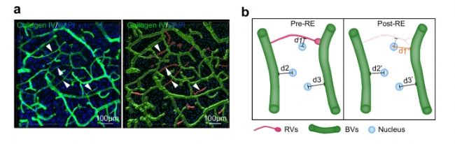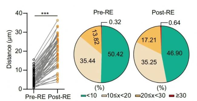 圖3. 腦血管自發性退化累積,導致神經元離血管的距離明顯變長,pre-RE, post-RE,退化前后