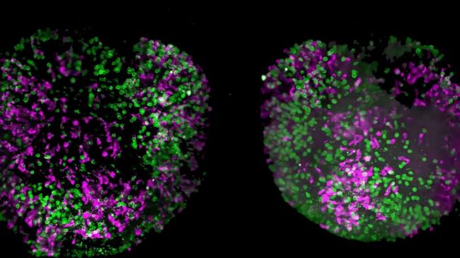標有層粘連蛋白(綠色)和微管蛋白(紫紅色)的腦類器官。由Akanksha Jain提供。Treutlein Lab ETH-DBSSE Basel(瑞士)。