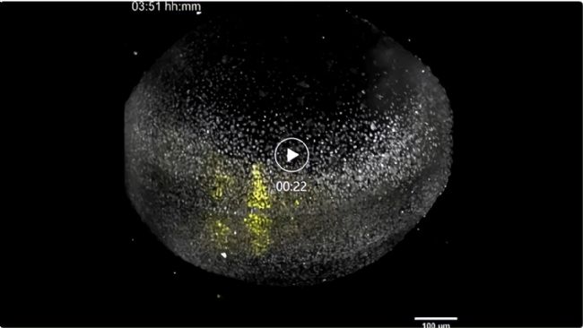 循環(huán)基因成像(黃色)揭示了斑馬魚胚胎的體節(jié)發(fā)生時間。由Oates實驗室的Olivier Venzin提供。EPFL 洛桑(瑞士)