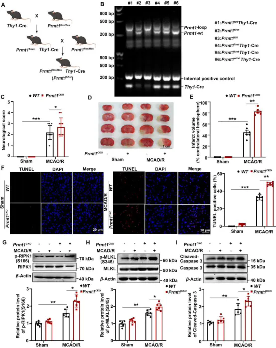 為了進一步研究PRMT1在體內腦I/R損傷中的潛在作用,作者在MCAO/R前30分鐘將MS023(PRMT1的抑制劑)注射至小鼠腦室內。發現MS023處理明顯增加了MCAO/R誘導的神經功能缺損評分和梗死體積,加重了海馬和皮質神經元形態損傷,增加了TUNEL陽性細胞數量。此外MS023進一步增加了I/R腦組織中p-RIPK1(S166)、p-MLKL(S345)和活化型Caspase-3蛋白水平,以及IL-1β、IL-6和TNF-α等促炎細胞因子的mRNA水平。作者還構建了Prmt1神經元條件性敲除小鼠(Prmt1 CKO),然后對Prmt1 CKO小鼠和WT對照進行了2小時MCAO和24小時再灌注。同樣發現PRMT1缺乏會增加神經功能缺損評分、梗死體積和TUNEL陽性細胞比例,提高p-RIPK1(S166)、p-MLKL(S345)和活化型Caspase-3蛋白水平。這些數據表明Prmt1的藥物抑制或基因敲除加劇了腦I/R損傷。