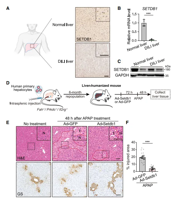 為了研究SETDB1的潛在臨床意義,作者分析了診斷為藥物性肝損傷(DILI)患者的活檢樣本。與正常肝臟樣本相比,DILI起始階段SETDB1蛋白和mRNA水平顯著降低。為確定異位SETDB1是否可以保護人類肝臟免受化學或藥物引起的損傷,建立了一個人源化小鼠肝臟模型,并對其進行了APAP過量治療。在APAP過量前3天遞送了Ad-SETDB1或Ad-GFP,在APAP過量后48小時,與Ad-GFP對照組小鼠相比,用Ad-Setdb1治療的人源化小鼠肝臟顯示出組織學改善和中心周圍損傷減少,以上結果為SETDB1保護人源化小鼠肝臟免受APAP誘導的急性肝損傷提供了證據。